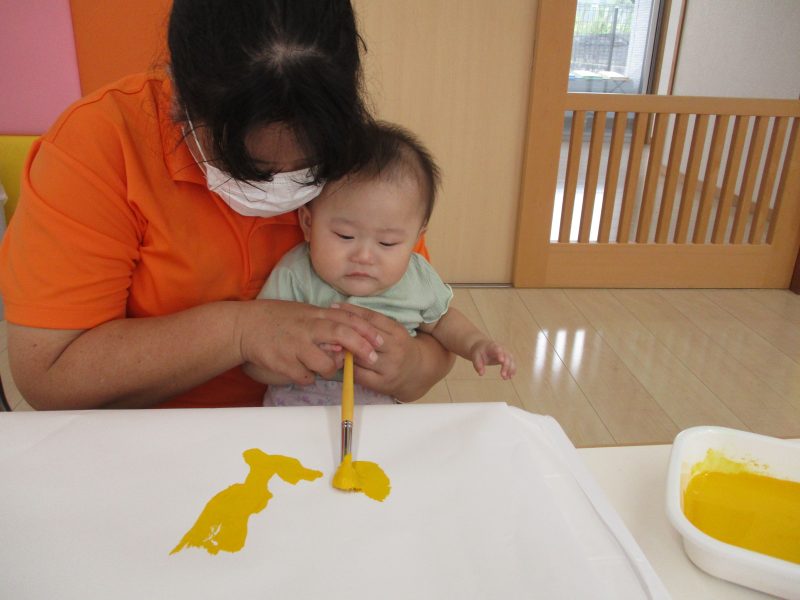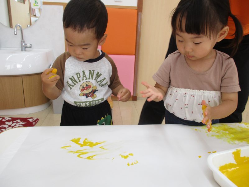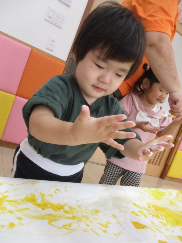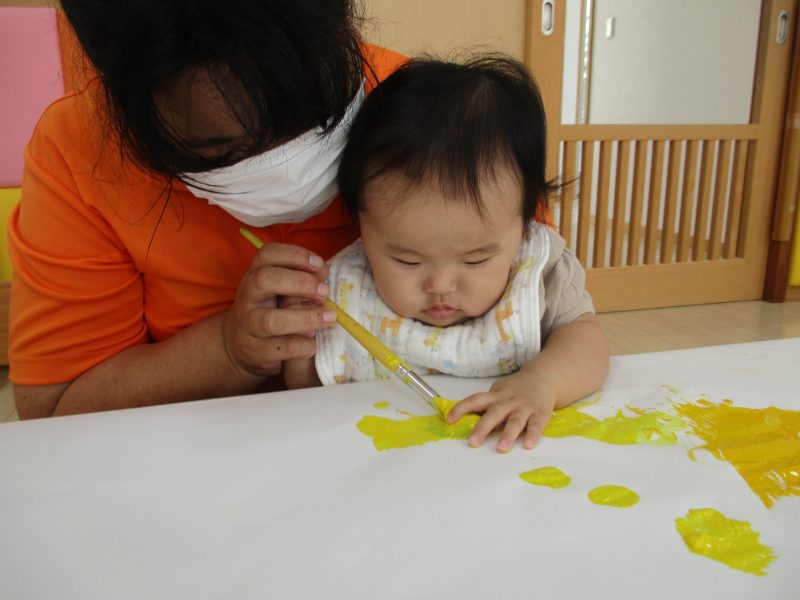 絵筆?を握ってみたり、大胆に手で塗ったり。その手をかおに持っていき顔に絵の具がついてしまう子も?