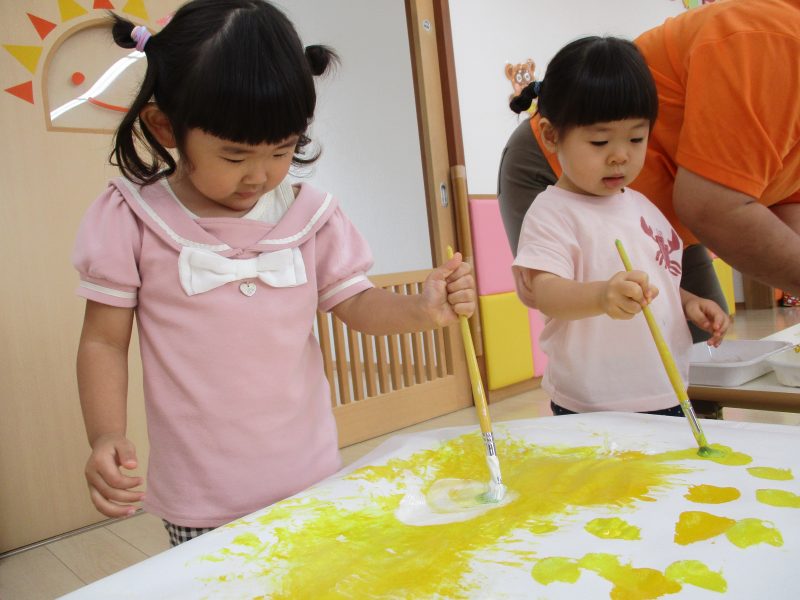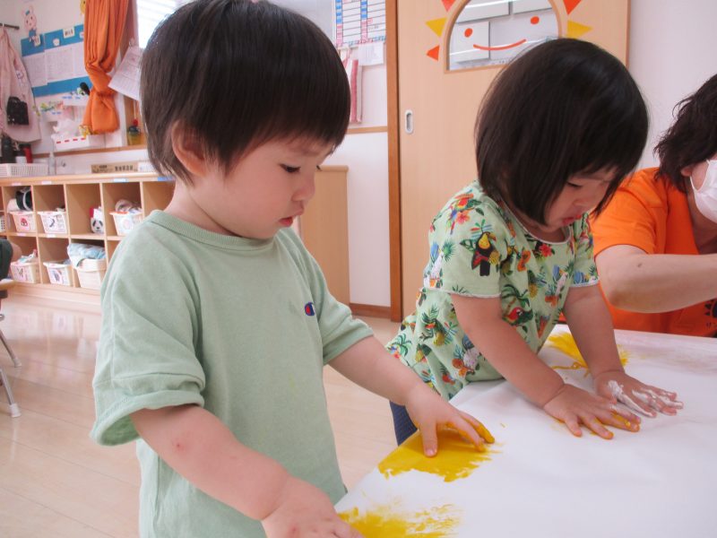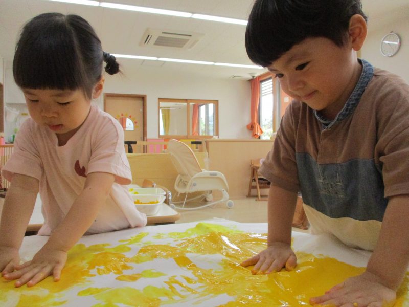 大きな模造紙にオレンジ色や、黄色、白の絵の具を塗りましたよ?
