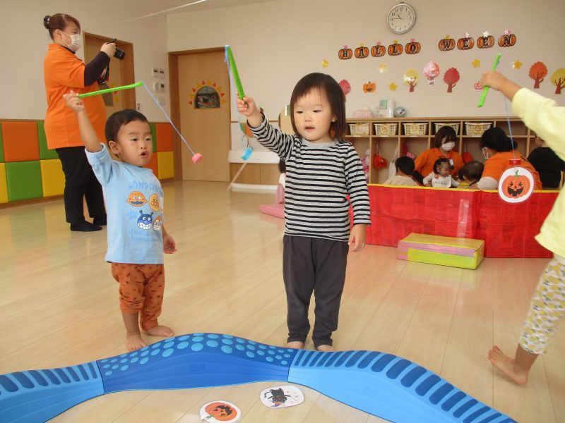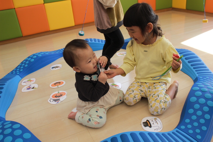 釣ったおばけ?をもも組のお友だちにあげる優しいりんご組の姿も見られました![]()