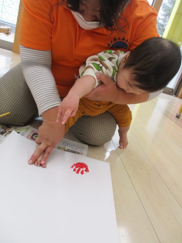 絵の具で手形足形もとりました。なにをされるんだろう?と神妙な顔ですよ?