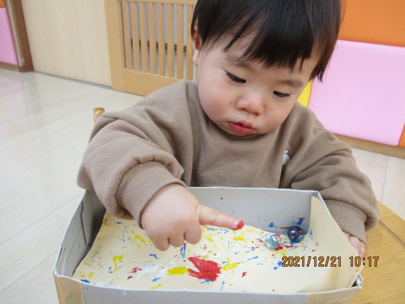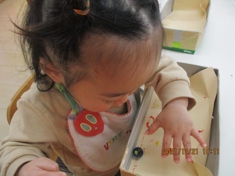 箱の中にビー玉を?入れてころころ~。でもどうしてもビー玉が掴みたくなってしまうみたいです(❤´艸`❤)
