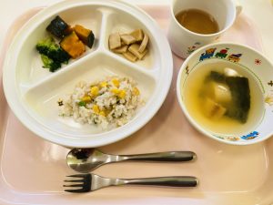 ツナコーンチャーハン 味噌汁 高野豆腐の煮物 温野菜
