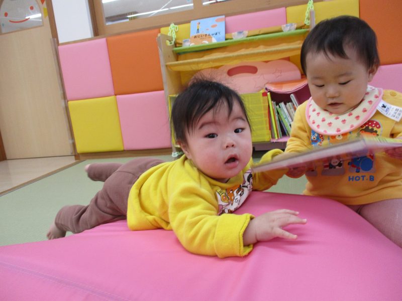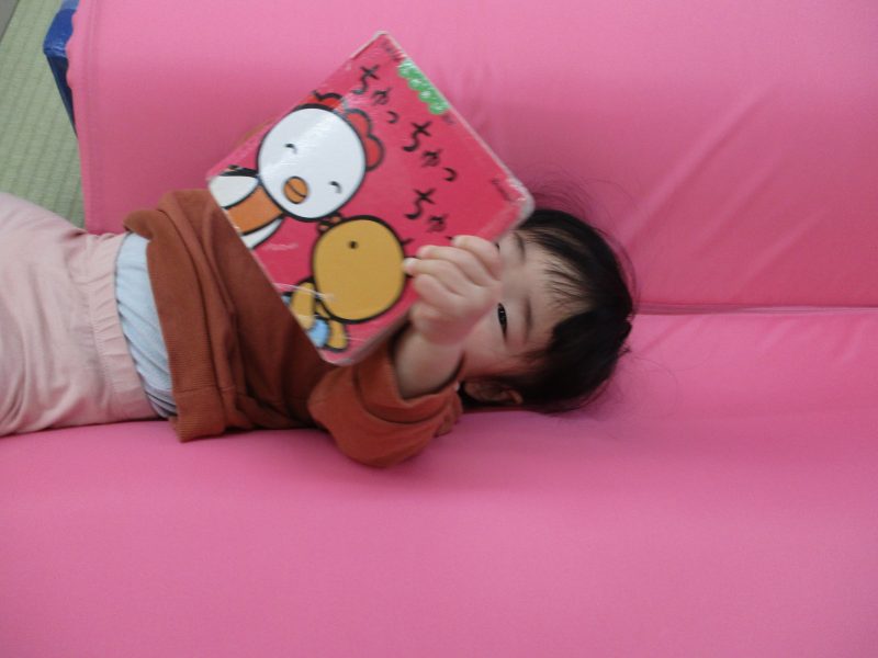 凸凹マットのくぼみに寝転がって絵本を読んでいました?