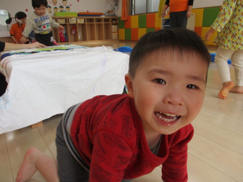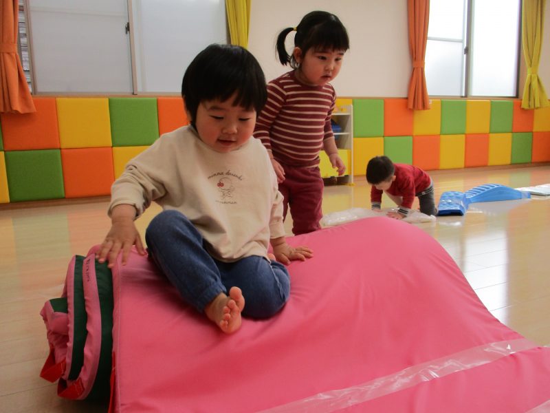マットで作った柔らかいお山はバランスをとるのが難しいけど、日々の遊びの中で体力がついてきて簡単に乗り越えることができるようになりました![]()
