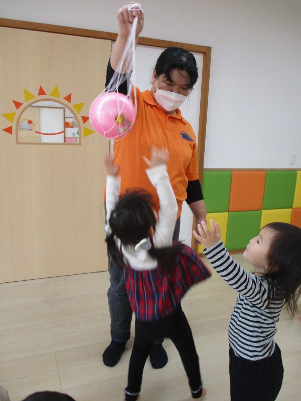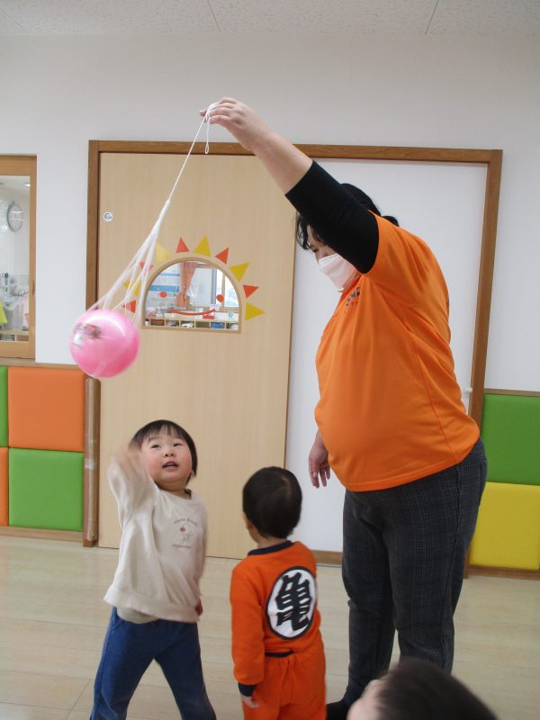 高いところにあるボールに?手を伸ばしてポーンと叩きます。