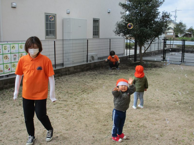 追いかけても追いかけても次々と飛んでくるシャボン玉に子どもたちは大はしゃぎでした?