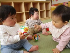 ボールを追いかけて拾ったり、友だちが持っている物にも興味津々です![]()