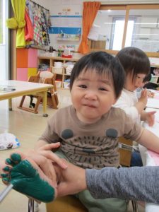 こちらは何やら足の裏に絵の具を塗ってもらっています。