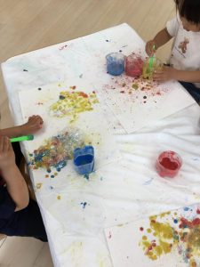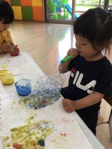 色をつけたシャボン玉液を画用紙に向かって吹くと、あわがモコモコ~と出たり、