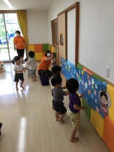「今日の夜に織り姫と彦星が出会えるように室内にあるお星様⭐をたくさん見つけて『天の川』に張るよ~⭐」