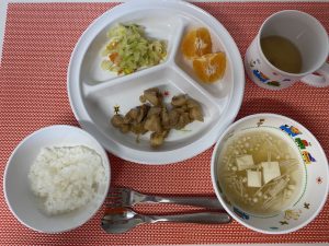 ごはん すまし汁 照り焼きチキン キャベツのソテー オレンジ