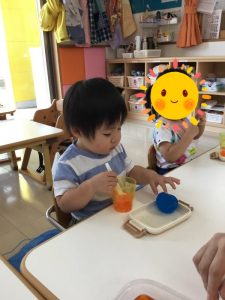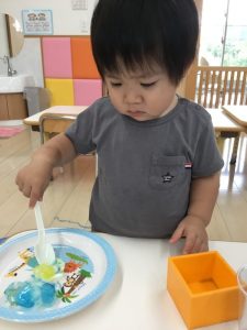 普段のこんな遊びからも「スプーン?を握る」事への興味に繋がりますよ。