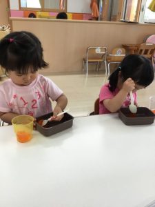 お弁当箱に入れたゼリーをスプーンで崩して「オリジナル弁当?」を作っていましたよ。