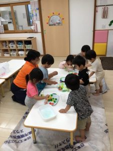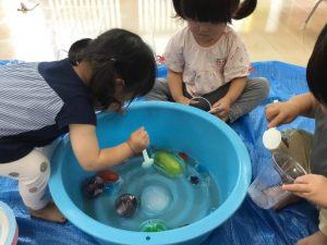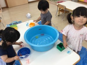 水遊びが中々出来ない中、各クラスが涼しく楽しい遊びをしていましたよ。