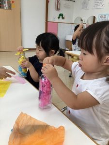 お花紙をクシャクシャにしてペットボトルに入れて〜