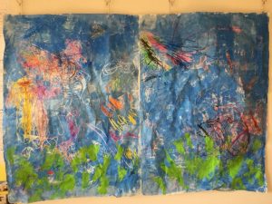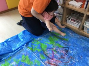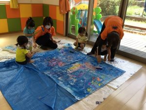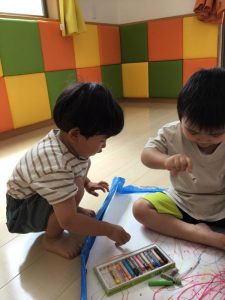 大きな模造紙にぺったりと座り込んで、クレヨンでお絵描きです。