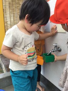 ホースから流れる水を掬おうとしたり