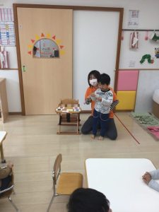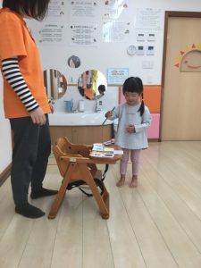 色を探して、「ピンクあった〜」と部屋の色んなところを探したり、うれしそうにお友だちの洋服や保育士の服をタッチしていますよ