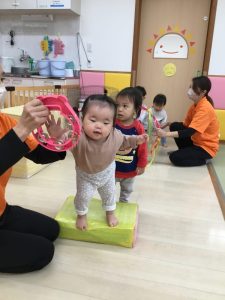 りんご組🍎のお友だちは、背伸びをして、「グーン」と手を伸ばして「タッチ🤚」