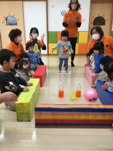 2チームに分かれてピンを倒した数を競います![]()