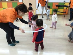 保育士がフープを持っているので、くぐったり上から通してもらったり