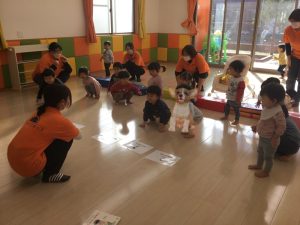 動作の絵カードを、保育士がするフラッシュカードを真剣に見ています!!