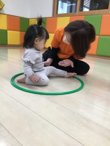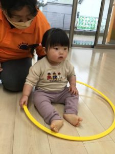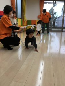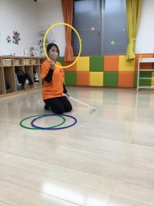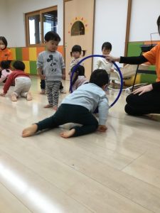 フープを使って♩ロンドン橋 に合わせて潜っていきました😁