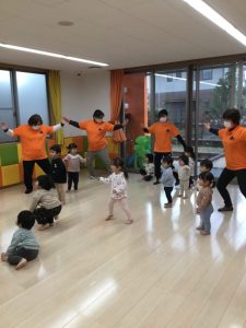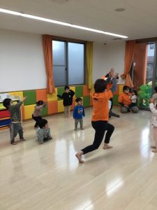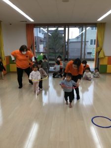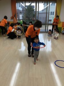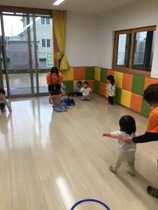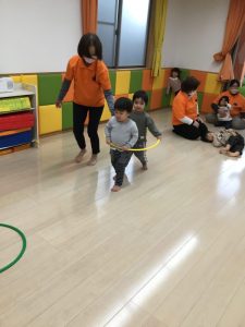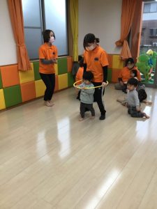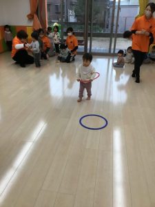 今日の体操は電車ごっこのようにお友だちと一緒にフープに入って、くるりと回ってタッチ交代です✋