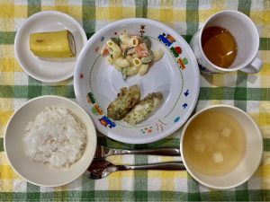 ご飯 味噌汁(じゃが芋・玉ねぎ) 魚の磯辺焼き マカロニサラダ バナナ