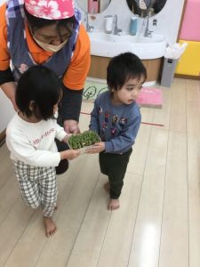 豆苗の水換えは、りんご🍎組のお当番さんのお仕事になりました。