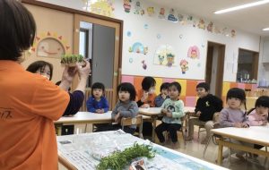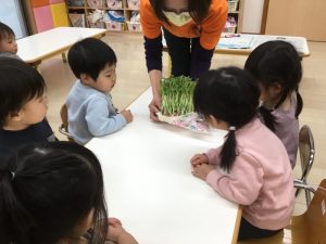 「豆苗ってこんなお野菜だよ。水で育てるんだよ」