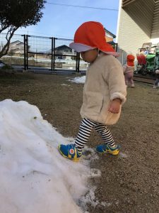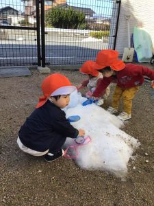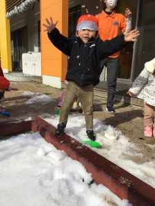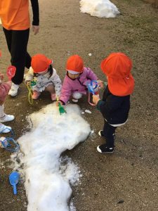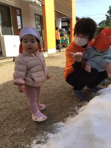 天気の良い日☀️園庭に少しだけ残っている雪❄️で子ども達は雪遊び❄️を始めましたよ〜😆