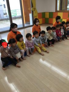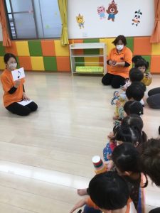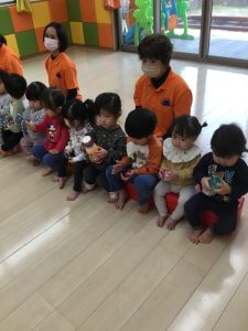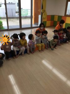 楽器を使って「こぎつね」と「おもちゃのマーチ」の歌に合わせてリズム遊びです♬