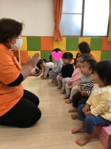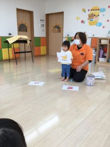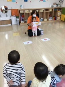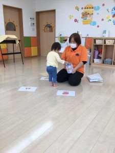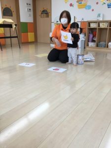 今日はいちご組さんに出てきてもらって、好きなカードを選び、名前の数を太鼓で叩きます🥁