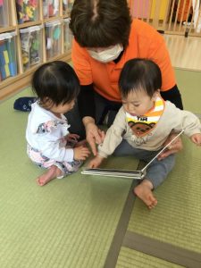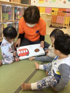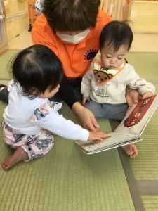 もも組さんは、先生の側で一緒に絵本に触れながら楽しんでいますよ😊
