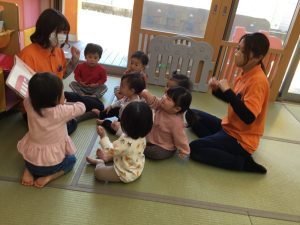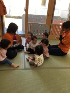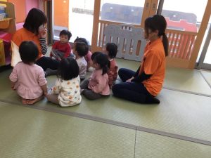 いちご組さんは、先生を囲んでお友だちと一緒に絵本を楽しむ事ができるようになります。