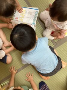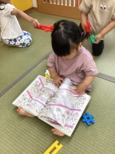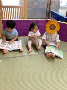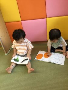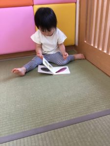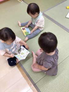字が読めない未満児さんは、絵を見るだけ、ページをめくるだけでも絵本に親しみ楽しんでいるんですよ![]()
