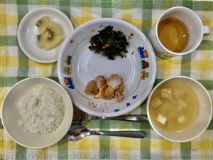 ご飯 味噌汁(キャベツ・厚揚げ) 鶏のからあげ 小松菜とひじきの和え物 キウイ