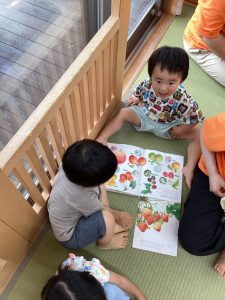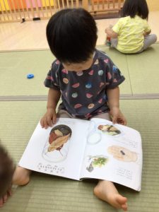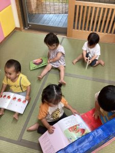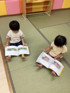 自分の選んだ絵本を抱きしめたまま、お友だちが見ている絵本を横から一緒に見る姿もよく見られます。