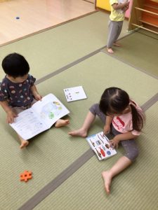 一緒に見たことがきっかけで、そのあと仲良く遊んでいる姿も見られるので、絵本は友だち作りにとっても欠かせないもののようです![]()