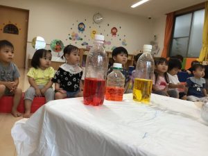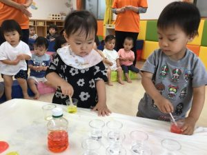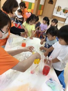 するとさらさらしていた液体がだんだん固まってくるので、子どもたちは「あれ❓」と不思議そうでした![]()