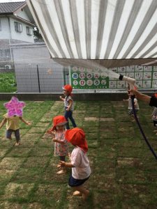 たまに降り注ぐ太陽の光を浴び、心地よく水遊びが出来る天候の中でスタートした園庭での水遊び![]()