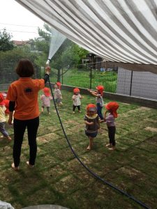 園庭の中央にタープが張られたり、水遊び用のおもちゃが登場したりして子どもたちはワクワク![]()