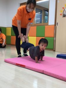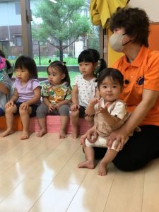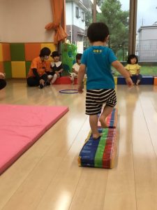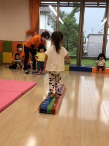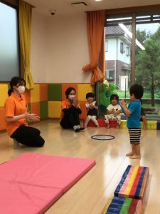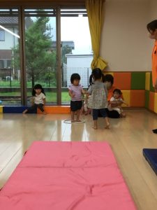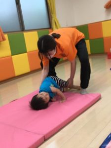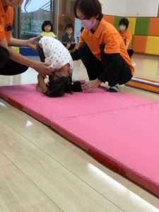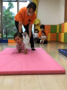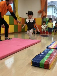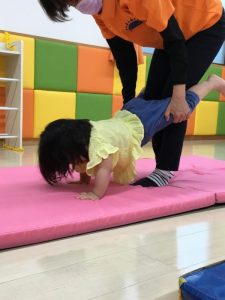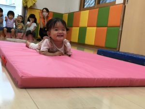 りんご組は前転、いちご組は手押し車、もも組ははいはいをしましたよ