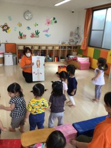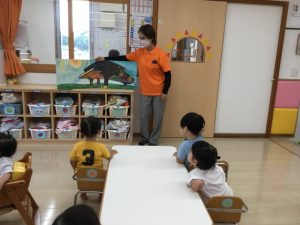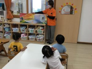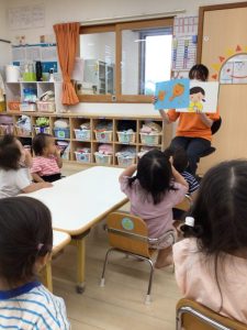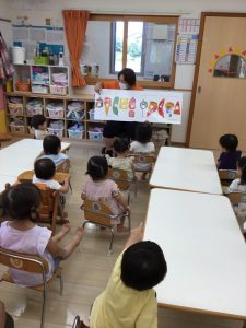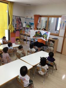 自分の見たい時に気軽に手に取る事が出来る大きさの絵本は、子ども達にとって、とても身近なものですが、紙芝居や大型絵本は、先生が読んでくれるちょっと特別な絵本のような気がするみたいで、子どもたちは目をキラキラさせて見入っています![]()