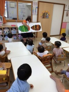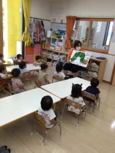 そんな元気いっぱいの子どもたちが、さらにパワーアップ出来るように今週は「お楽しみ絵本デー」と称して普段なかなか読んでもらう機会が少ない大型絵本や紙芝居を日替わりで楽しみました![]()