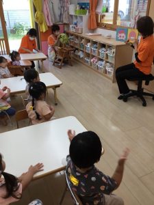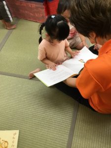 その日その時の気分で、一人が良かったり先生のお膝の上が良かったりと読み聞かせのスタイルが変化する子どもたちです![]()