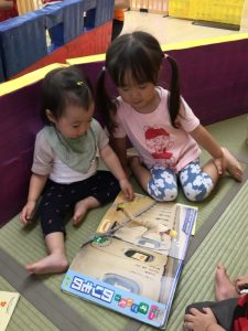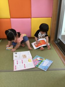 隣同士に座ってそれぞれ好きな絵本を読んでいます📚