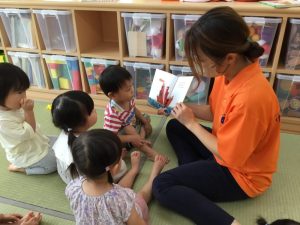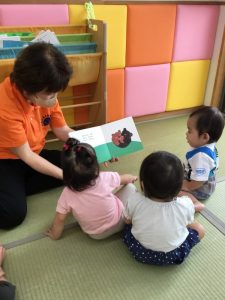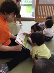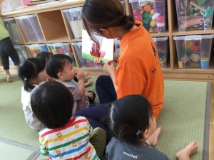 CDでバックミュージックを聴きながら大型絵本を楽しんだり、自分の好きな絵本を大事そうに抱えて先生のお膝に座って読んでもらったり… 本当に絵本好きな子どもたちです