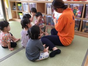 今週は学年ごとに月刊絵本の読み聞かせをしたので、その様子をお伝えしたいと思います